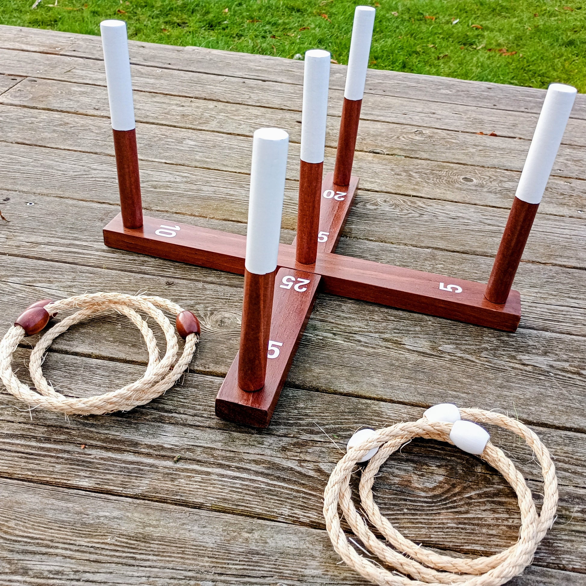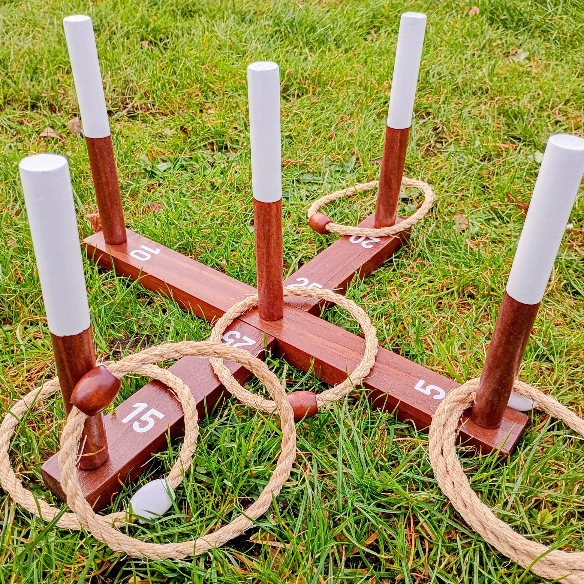 Spillet leveres med 2 x 3 lækre ringe i kraftfuld reb og med tydelig markering i hvid og brun farve så der nemt kan dystes. Dertil et lækkert ringspil med pointanvisning. Der medfølger desuden en bæretaske, som gør det nemt at transportere og opbevare spillet. Perfekt til stranden, haven og parken.